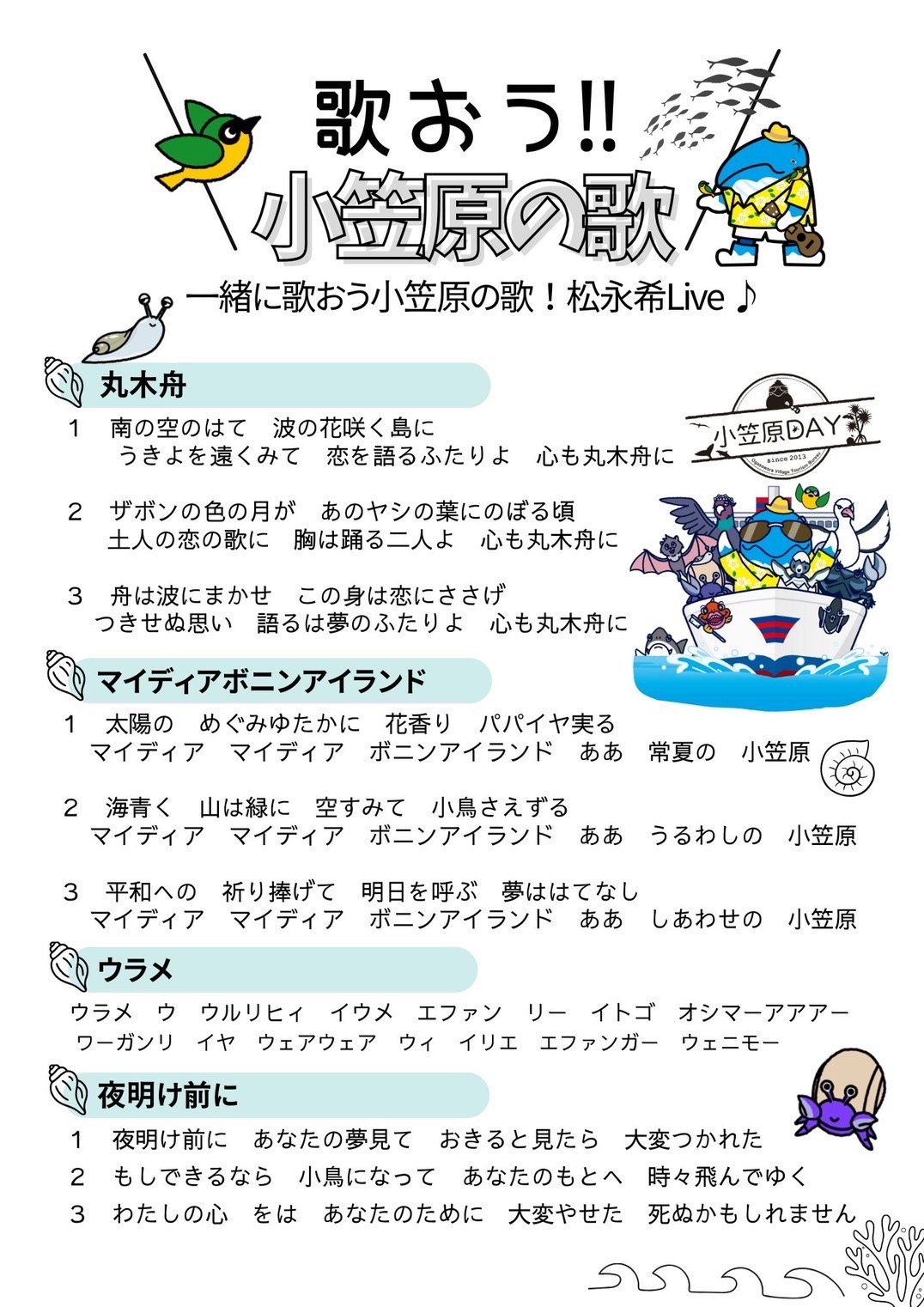 下北沢ラ・カーニャ応援 コンピレーションアルバム「Live at La Cana」 <参加アーティスト> The End/知久寿焼と四家卯大/原マスミ/松永希 with 今井忍,ロケットマツ,アンドウケンジロウ/ママクリオ ママクリオの声かけで始まった、下北沢ラ・カーニャでのライブ音源を 集めたコンピレーションアルバムができました! ぜひぜひ!みなさま聞いてください! ※詳細はこちら 最新ライブ情報 ●『小笠原DAY 2026 vol.11』 ◆2026.02.08(日) 11:00〜17:00 会場:竹芝客船ターミナル 料金:入場無料 ※松永希のライブ予定 15:10〜 ●梅津和時 プチ大仕事 2026 其の四/こまっちゃクレズマ 「うたとうた」 ◆2026.03.21(土) 19:00 開場/19:30 開演 会場:新宿 『PIT INN』 Tel (03)3354-2024 出演:梅津和時、多田葉子、松井亜由美、張紅陽、関島岳郎、夏秋文尚+松永希 料金:予約 4,400円 / 当日 4,950円 各+1ドリンク付き(2/1より前売り開始) ●今後のライブスケジュール(予定) ※現在調整中です。詳細は決まり次第、掲載いたします。 |
