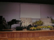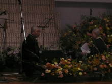 ![]() ステージに塔婆 ご詠歌をバックに 仕掛人 作務衣を着て |